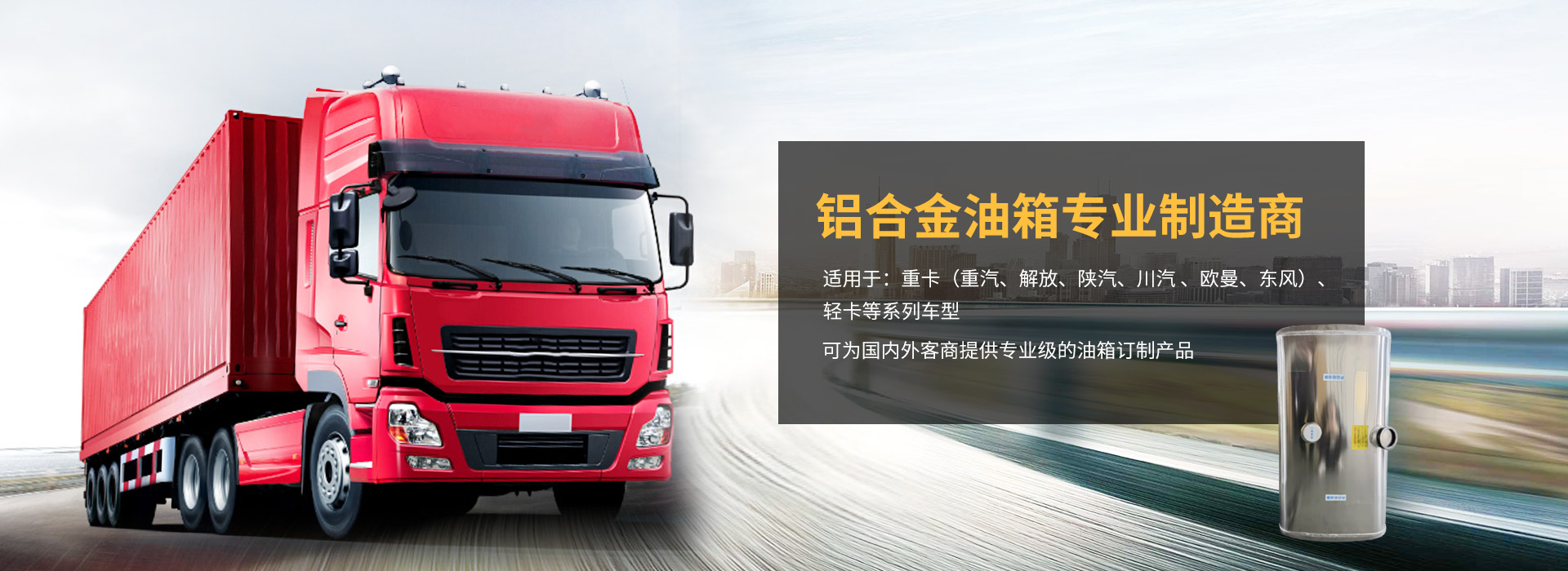 公司目前开发生产的铝合金油箱适用于:重卡(重汽、解放、陕汽、川汽 、欧曼、东风)、轻卡等系列车型。油箱规格(容量260L-600L)已达七十余种,公司年生产能力已达25万套,并可为国内外客商提供专业级的油箱订制产品。
